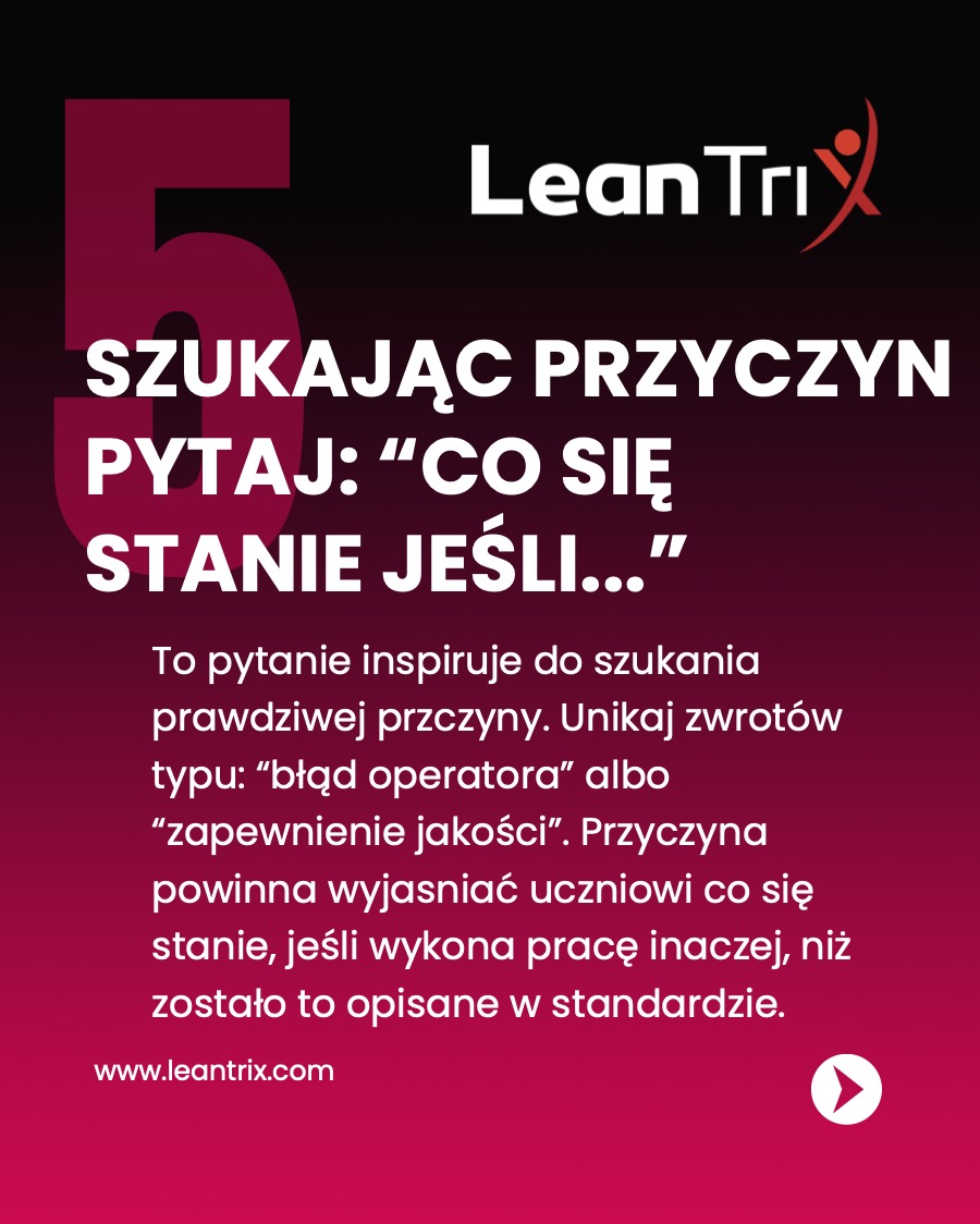 To pytanie inspiruje do szukania prawdziwej przyczyny. Unikaj zwrotów typu: “błąd operatora” albo “zapewnienie jakości”. Przyczyna powinna wyjasnić uczniowi co się stanie, jeśli wykona pracę inaczej, niż zostało to opisane w standardzie.