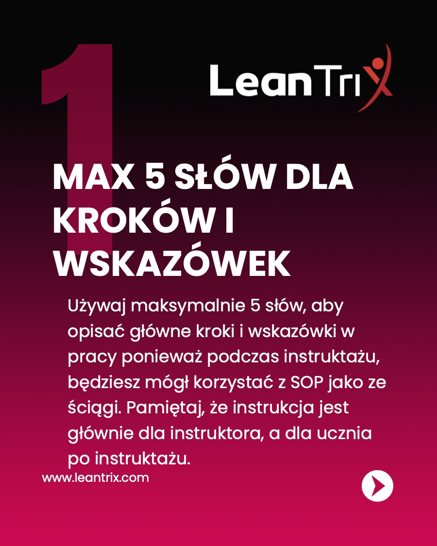 Przede wszystkim, używaj maksymalnie 5 słów, aby opisać główne kroki i wskazówki w pracy, ponieważ podczas instruktażu instruktor będzie mógł korzystać z SOP jako ze ściągi. Pamiętaj, że instrukcja służy głównie instruktorowi, a dla ucznia staje się przydatna dopiero po przeprowadzeniu instruktażu.
