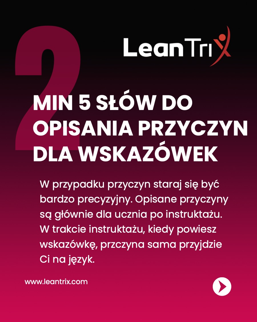 W przypadku przyczyn staraj się być bardzo precyzyjny. Co więcej, opisane przyczyny mają znaczenie głównie dla ucznia po instruktażu. W trakcie instruktażu, kiedy powiesz wskazówkę, przyczyna sama przyjdzie Ci na język, co znacznie ułatwia przekazywanie wiedzy.