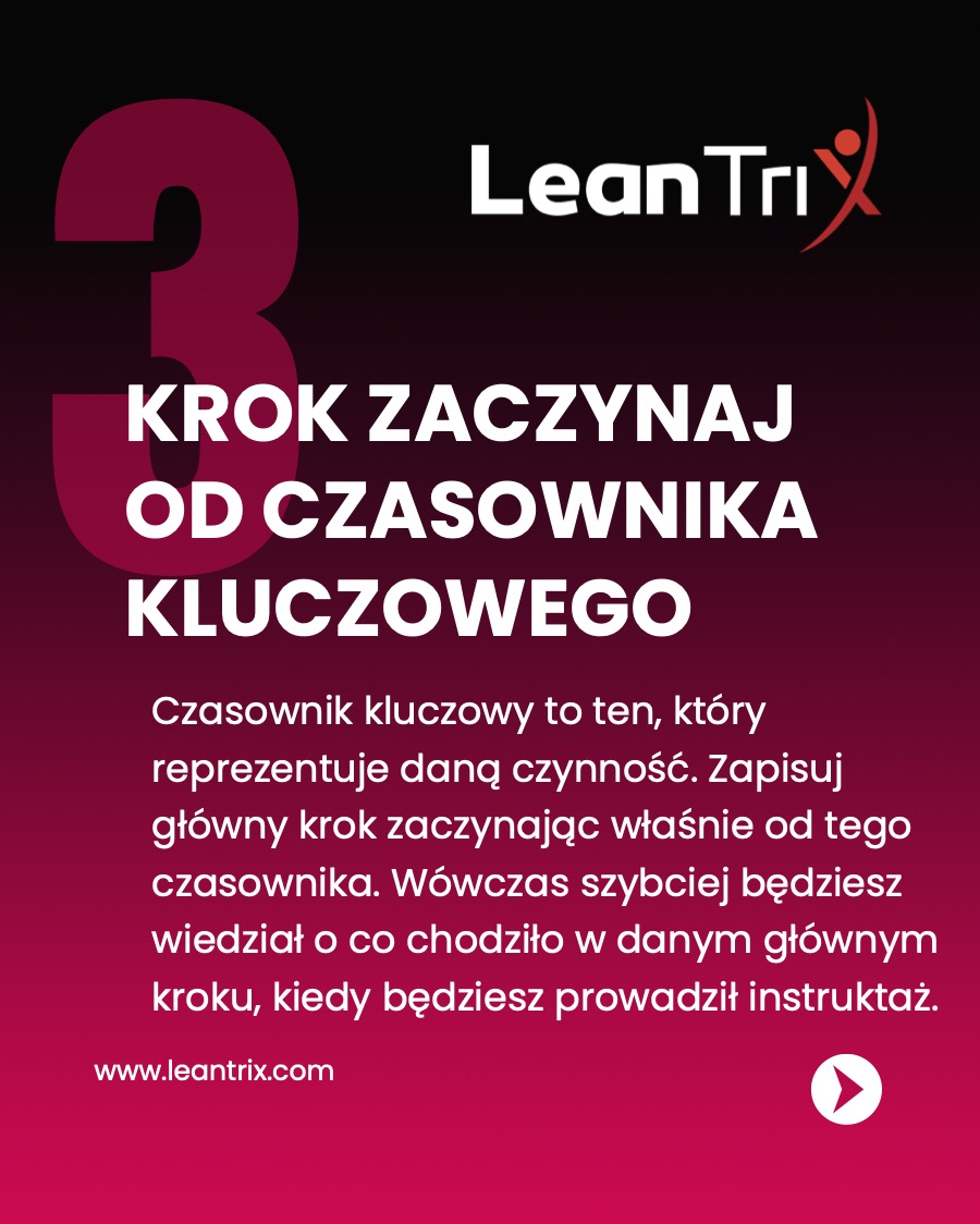 Czasownik kluczowy to ten, który reprezentuje daną czynność. Zapisuj główny krok zaczynając właśnie od tego czasownika. Wówczas szybciej będziesz wiedział o co chodziło w danym głównym kroku, kiedy będziesz prowadził instruktaż.
